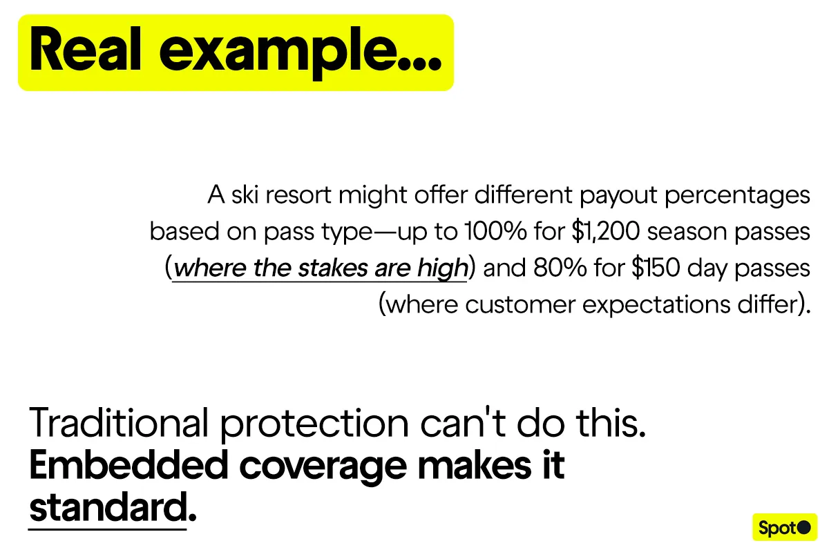 Yes—customization is one of embedded coverage's core advantages. Payout percentages, coverage windows, pricing structures, and even checkout presentation can all be tailored to your use case. A ski resort needs different terms than a concert venue, and both need different terms than a marathon registration platform. Traditional one-size-fits-all products can't accommodate this. Embedded coverage makes it standard practice.